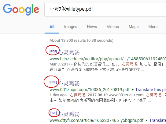 Google已经可以支持13种非HTML文件的搜索:PDF文件、Microsoft Office (doc, ppt, xls, rtf)、Shockwave Flash (swf)PostScript(ps)和其它类型文档。 新的文档类型只要与用户的搜索相关,就会自动显示在搜索结果中。例如,如果您只想查找PDF或Flash 文件,而不要一般网页,只需搜索 **“关键词filetype:pdf”** 或 **“关键词filetype:swf”** 就可以了。