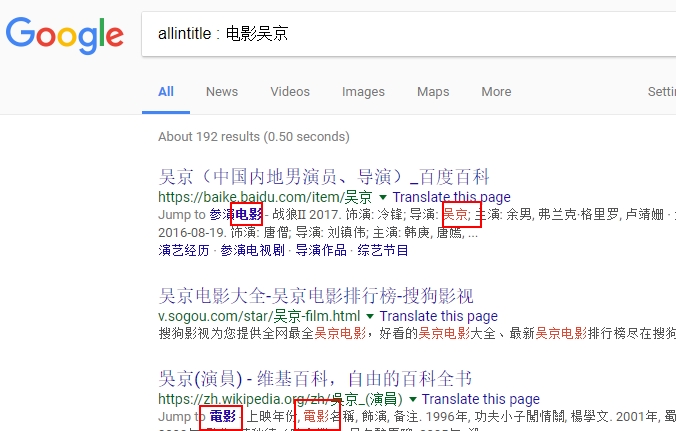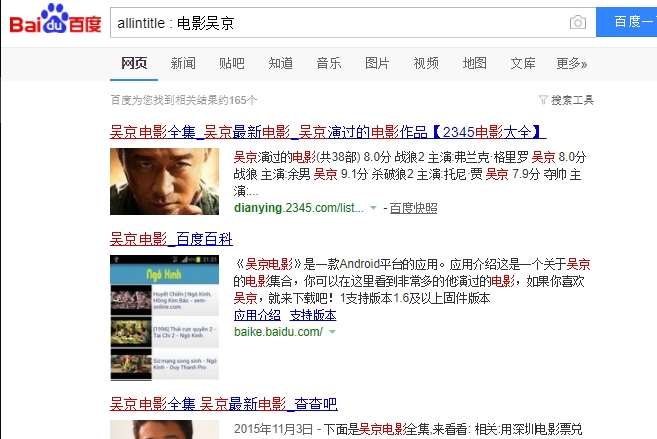 网页标题通常是对网页内容提纲挈领式的归纳。把查询内容范围限定在网页标题中,有时能获得良好的效果。使用的方式,是把查询内容中,特别关键的部分,用“intitle:”领起来。 例如,找林青霞的写真,就可以这样查询:写真intitle:林青霞注意,intitle:和后面的关键词之间,不要有空格。