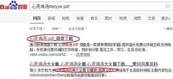 很多有价值的资料,在互联网上并非是普通的网页,而是以Word、PowerPoint、PDF等格式存在。百度支持对Office文档(包括Word、 Excel、Powerpoint)、Adobe PDF文档、RTF文档进行了全文搜索。要搜索这类文档,很简单,在普通的查询词后面,加一个“filetype:”文档类型限定。“Filetype:”后可以跟以下文件格式:DOC、XLS、PPT、PDF、RTF、ALL。其中,ALL表示搜索所有这些文件类型。例如,查找张五常关于交易费用方面的经济学论文。“交易费用张五常filetype:doc”,点击结果标题,直接下载该文档,也可以点击标题后的“HTML版”快速查看该文档的网页格式内容。